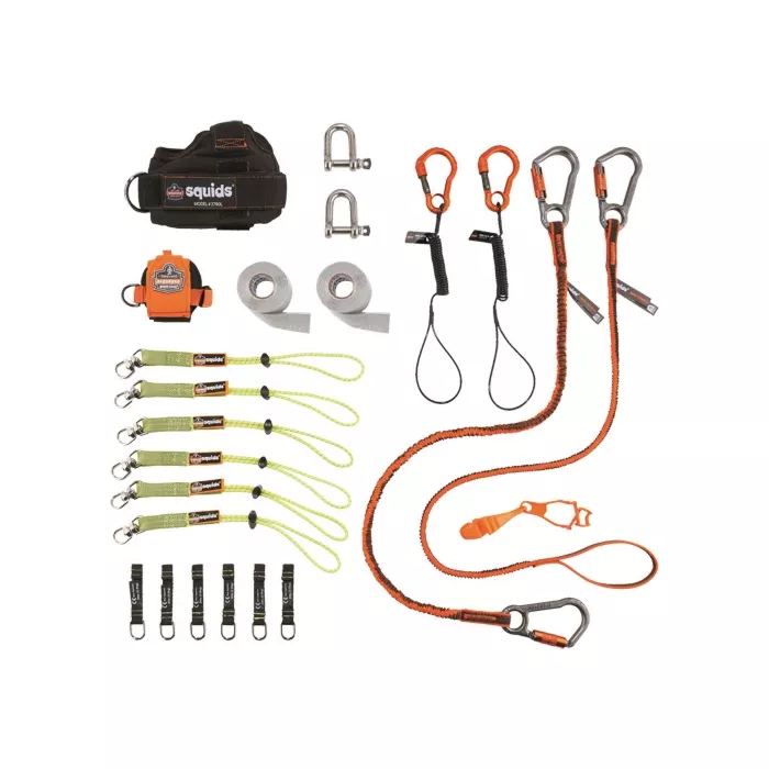 - Includes: (2) 3-pack of Squids® 3713 Elastic Swiveling Tool Tail™ attachments - 10lb rating, (1) 6-pack of Squids® 3700 Web Tool Tails™ attachments - 2lb rating, (2) 12 ft. (3.7m) rolls of Squids® 3755 Self-Adhering Tape Trap, (1) 2-pack of Squids® 3790XL Tool Shackle D-Rings, (1) Squids® 3770L Tape Measure Holder Trap, (1) Squids® 3780L Power Tool Holder Battery Wrap, (2) Squids® 3156 coil tool lanyards, single carabiner with 2lb rating, (1) Squids® 3108F(x) tool lanyard, single carabiner with 15lbs rating, (1) Squids® 3118F(x) tool lanyard, dual carabiner with 15lb rating, (1) Squids® 3400 Glove Grabber Dual Clip, (1) Convenient carrying case for easy transportation