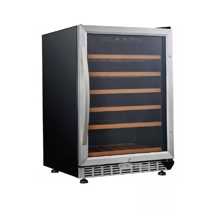 Urban and elegant design. Black finish with a stainless steel frame door, beech wood shelves, and fan-forced evaporator cooling system. Adjustable feet.