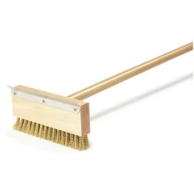 Long handle for reaching into and sweeping out ovens. Brass bristles are soft and flexible, but can withstand high temperatures when being used to sweep out food debris and ash. The heavy-duty scraper is for removing tough burnt-on carbon.