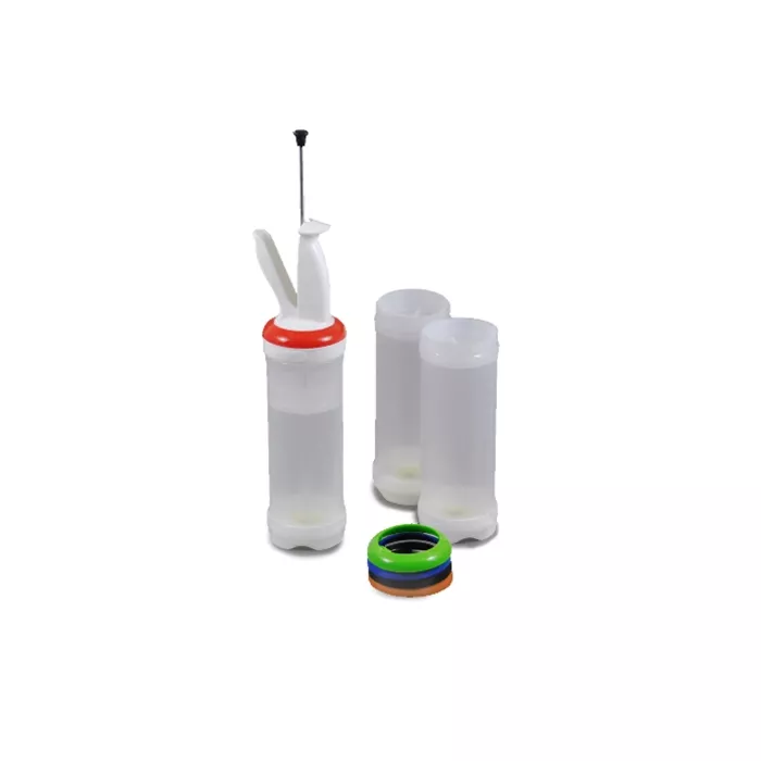 Includes: (1) Handle set, (3) 24 oz (710ml) bottles (1 hole dispensing cap, plunger and canister), (5) Fixed Portion Control Rings: 1/4 oz (7.5ml), 1/3 oz (10ml), 1/2 oz (15ml), 3/4 oz (22.5ml) and 1 oz (30ml)