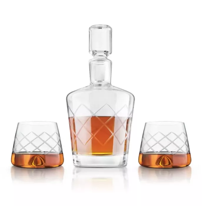 This DuraShield™ lead-free crystal whiskey decanter set is reinforced with Titanium for increased durability and to help resist chips or scratches. Barium is also added, in place of lead, to provide a truly lightweight crystal with an elevated brilliance.