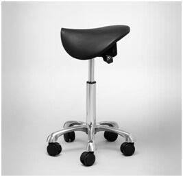 The Flight Saddle stool is the newest product to be added to the Flight family of operatory stools. The saddle stool is a multi-purpose stool that is appropriate for dental, medical, podiatry, ENT, beauty, spa, tattoo, veterinarian, lab, technical and office use. Saddle stools are very similar in look, design and feel as an equestrian saddle. The saddle design for seating comes with a pneumatic gas cylinder to allow the user to adjust the correct height to reach the optimal angle of 135 degrees between the hips and knees. On traditional chairs your hips and knees are typically at a 90 degree angle causing most people to naturally slouch or hunch over and over time this can lead to chronic shoulder and back pain. A 135 degree angle promotes proper posture and allows your spine to be in a healthy lordotic curved position that helps to reduce the pressure and stress on your spinal cord and to create a stronger core. It has been clinically proven that the use of a saddle stool is able to build muscle as the stool forces the user to sit up straight thus building both your upper leg, buttocks, abdominal and leg muscles.