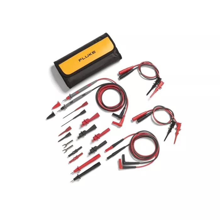 - Includes: Quadfold nylon pouch, Pair of 10A silicone insulated test leads, Pair of 5A insulated alligator clips, Pair of 3A insulated probe tip extenders, Pair of 10A modular test probes with banana connectors in handles, Pair of 5A modular hook-style clip test leads with banana connectors, Pair of 5A modular pinch-style clip test leads with banana connectors, Pair of 3A slide-on IC probe tip adapters & test lead couplers, Pair of 10A bare spade lugs with banana connectors