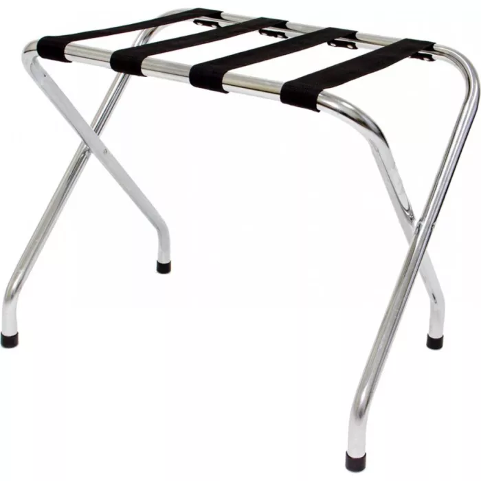 Metal luggage stand with reinforced black strapping is an economical amenity for guest rooms. Large enough for any suitcase yet folds easily to reduce storage space. Very popular with hotels and now available for use in your home! Our folding luggage racks have been specially designed with steel rivet points and lower cross braces to make them more durable under use in a busy hotel where they are folded and unfolded frequently. Commercial grade Chrome foldable luggage rack with strong heavy duty strapping. Our racks have been constructed from high quality tubular steel for added strength, however remain light and are easy to store. Perfect for any size accommodation and helps prevent guests scratching your good tables and benches.
