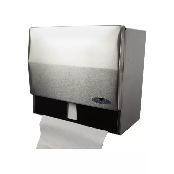 - Universal paper towel dispenser will accept all standard single fold and roll towels (max. 6″ diameter and up to 10″ long)