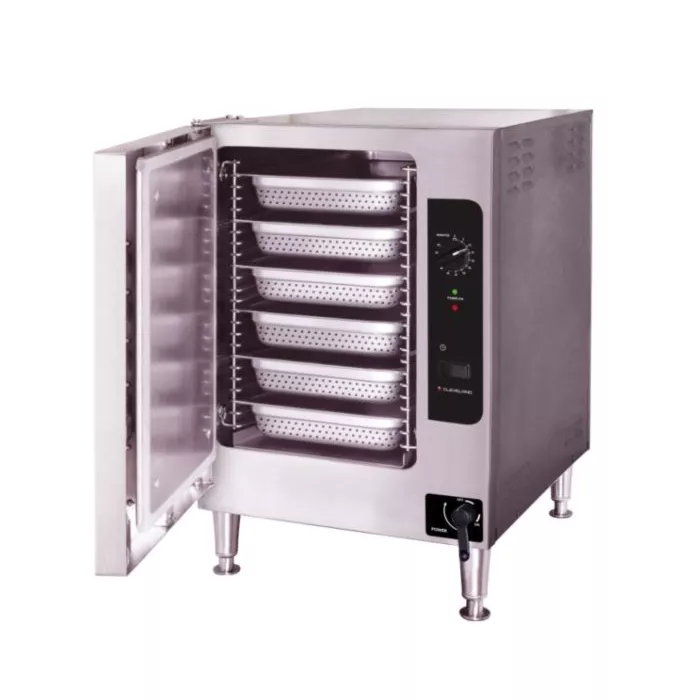 Exclusive SureCook Compartment Controls improve cooking speed and accuracy. New energy-saving design reduces water and electric usage. On-demand power control for faster heats up and recovery. Energy-saving Standby Feature when not in use. The SureCook timer automatically adjusts the cooking time with the volume of the product being cooked, eliminating guesswork on when the product is finished. Includes a 60-Minute Electro-Mechanical Timer, LED Indicator Lights for SureCook Cycle, Power On, and Reset. Timed and Manual Bypass Switch for constant steaming.