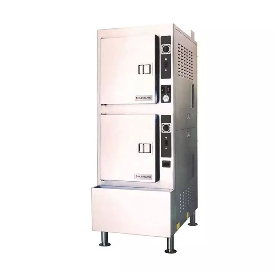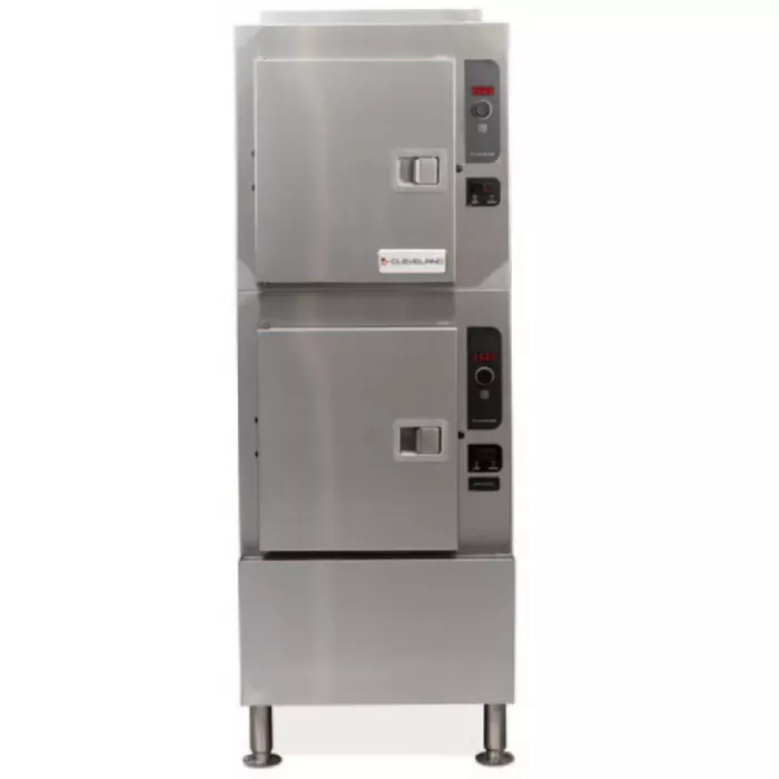 Pressureless cooking permits doors to be opened during operation. Capacity for up to ten 12" x 20" x 2 1⁄2" deep Cafeteria pans, five each compartment.
