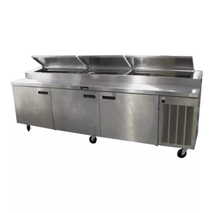 Constructed of one-piece 18-gauge stainless steel, with integral 2.12" (5cm) high square nosing at the front. Top has a mechanically cooled refrigerated raised rail at the rear with openings to accommodate pans (provided by others). Rail interior is 22-gauge stainless steel. Raised rail openings have 18-gauge stainless steel removable lids. Unit is equipped with separate expansion valve and on/off switch for refrigerated rail. Temperature in top openings maintains 33°F (1°C) to 41°F (5°C) with pans recessed 2" (5cm) at 86°F ambient room temperature, meeting NSF 7 requirements.