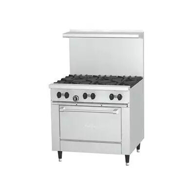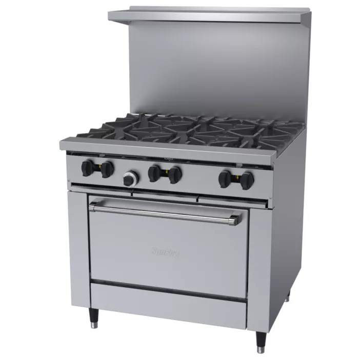 Gas restaurant series range with standard size Sunfire oven. 35.45" (900mm) wide with a 27" (686mm) deep work top surface. Stainless steel front, sides and 4"(102mm) wide front rail. 6" (152mm) legs with adjustable feet. Six robust 2 piece 30,000 Btuh/8.797 kW (Natural gas), cast open burners set in split cast iron ergonomic grates. Griddle or optional hot top with cast iron "H" style burners, 18,000 Btuh/5.27 kW (natural gas), in lieu of open burners. Porcelain oven bottom and door liner. Two position fixed rack guide w/one oven rack. Heavy duty oven door with "keep cool" door handle. Straight steel tube oven burner 33,000 Btuh/9.67 kW (natural gas) provides quality bake and good recovery . Oven thermostat ranges from Low to 500° F (260° C). Available with storage base in lieu of oven.