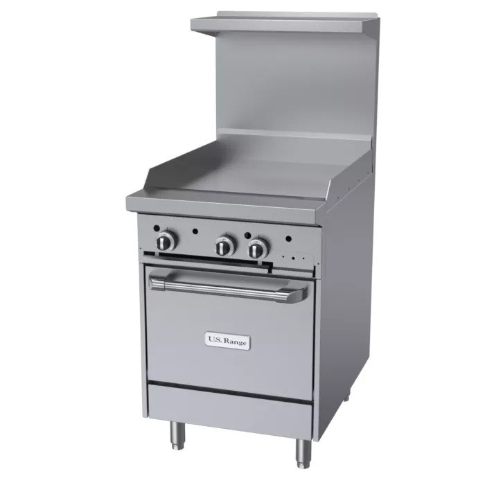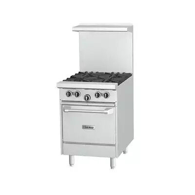 Gas restaurant series range with space saver oven. 23-5/8" (600mm) wide and 27" (686mm) deep work top surfaces. Stainless steel front, sides and 5" wide front rail. 6" (152mm) legs with adjustable feet. Four powerful 2 piece 32,000 Btuh/9.37 kW (Natural gas), cast open burners set in split cast iron ergonomic grates. Griddle or optional hot top with cast iron "H" style burners, 18,000 Btuh/5.27 kW (natural gas), in lieu of open burners. Porcelain oven bottom and door liner. Durable heavy duty oven door w/ "keep cool" handle. Heavy cast iron "H" 32,000 Btuh/ 9.37 kW (natural gas) oven burner controlled by even bake, fast recovery snap action modulating oven thermostat. Available with storage base in lieu of oven.