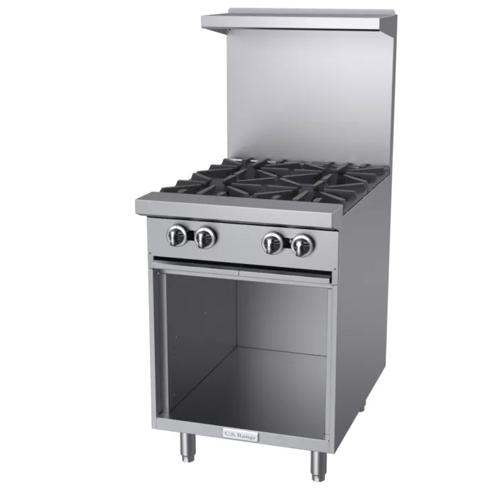 Gas restaurant series range with space saver oven. 23-5/8" (600mm) wide and 27" (686mm) deep work top surfaces. Stainless steel front, sides and 5" wide front rail. 6" (152mm) legs with adjustable feet. Four powerful 2 piece 32,000 Btuh/9.37 kW (Natural gas), cast open burners set in split cast iron ergonomic grates. Griddle or optional hot top with cast iron "H" style burners, 18,000 Btuh/5.27 kW (natural gas), in lieu of open burners. Porcelain oven bottom and door liner. Durable heavy duty oven door w/ "keep cool" handle. Heavy cast iron "H" 32,000 Btuh/ 9.37 kW (natural gas) oven burner controlled by even bake, fast recovery snap action modulating oven thermostat. Available with storage base in lieu of oven.