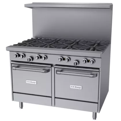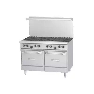 Gas restaurant series range with 2 space saver ovens, 20" (508mm) wide or large capacity oven 26-1/4" (667mm) wide. 47-1/4" wide, 27" (686mm) deep work top surfaces. Stainless steel front, sides and 5" wide front rail. 6" (152mm) legs with adjustable feet. Eight powerful 2 piece 32,000 Btuh/9.37 kW (Natural Gas), cast open burners set in split cast iron ergonomic grates. Griddle or optional hot top with cast iron "H" style burners, 18,000 Btuh/5.27 kW (natural gas), in lieu of open burners. Porcelain oven bottom and door liner. Durable heavy duty oven door w/ "keep cool" handle.