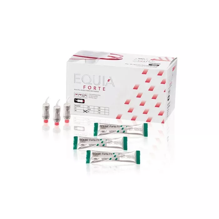 EQUIA Forte is the next generation of EQUIA that combines EQUIA Forte Fil and EQUIA Forte Coat to build a strong, superior bulk-fill system. EQUIA Forte Fil's glass hybrid innovation is achieved through the introduction of ultrafine, highly reactive glass particles, dispersed within the conventional Glass Ionomer (GI) Structure. With the addition of a higher molecular weight polyacrylic acid, the new glass hybrid formulation builds a high strength restorative. EQUIA Forte Coat incorporates a new multi-functional monomer that produces a tougher resin matrix. Together, these innovations result in a strong bulk fill glass hybrid restorative system with exceptional physical properties and aesthetics. EQUIA Forte is ideal for Class I, II and V restorations. - Bulk-fill - Easy and quick to use - Not technique sensitive - Non sticky and packable - No polymerization shrinkage or shrinkage stress - Optimal marginal seal that offers long-term resistance to microleakage and discoloration - High fluoride release at tooth restorative interface with recharge capability - Outstanding resistance to wear and acid erosion 0.14 mL x 48 caps/box
