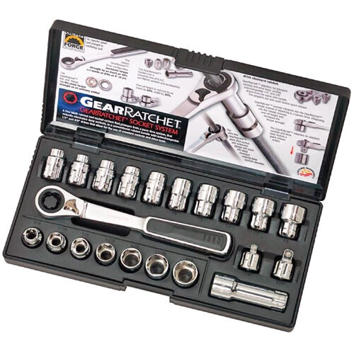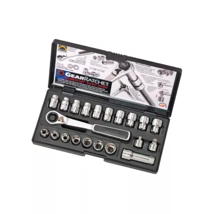 - Includes: Gear Ratchet handle, (7) SAE Vortex sockets (3/8" to ¾"), (10) Metric Vortex sockets (10mm to 19mm), 1/4" Dr. adapter, 3/8" adapter, and Vortex Pass-Thru 3" extension