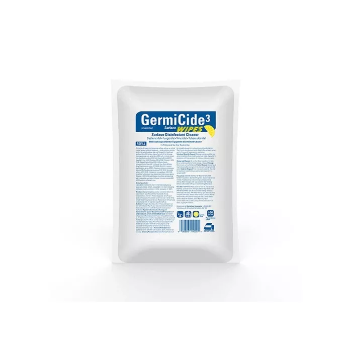 GermiCide 3 Surface Disinfectant Wipes are high-performance wipes designed to effectively clean and disinfect hard, non-porous surfaces. Measuring 6" x 7", these wipes come in a convenient refill package containing 160 wipes, ensuring a continuous supply for high-demand environments. The formulation of GermiCide 3 wipes targets a wide range of pathogens, such as bacteria, viruses, and fungi, offering a swift and effective solution for preserving a hygienic and secure environment.