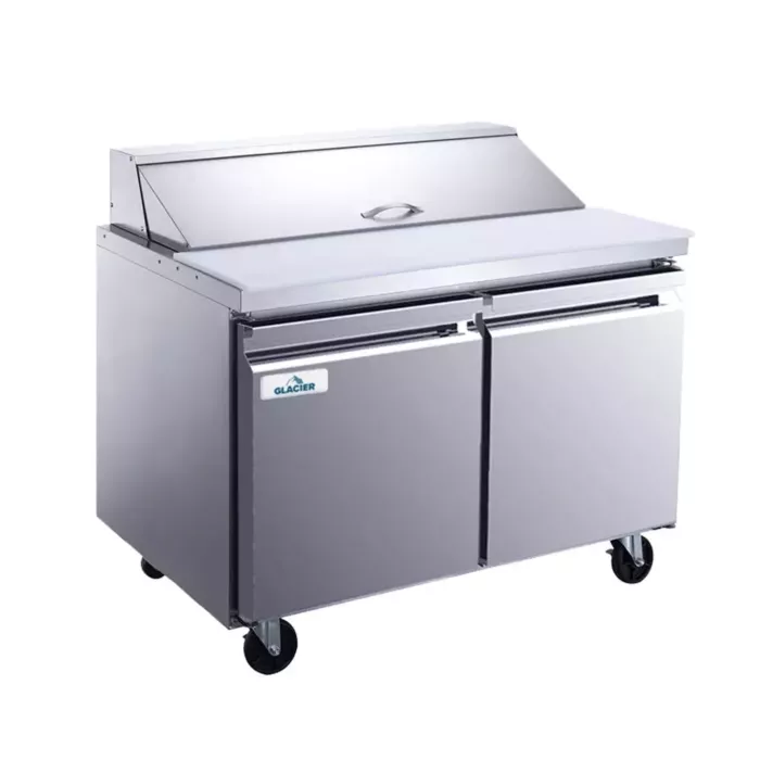 The Glacier GST-48-12 48" Sandwich / Salad 12 Pan Refrigerated Prep Table with 2 doors is constructed with Durable brushed stainless steel to handle years of use while being easy to maintain.