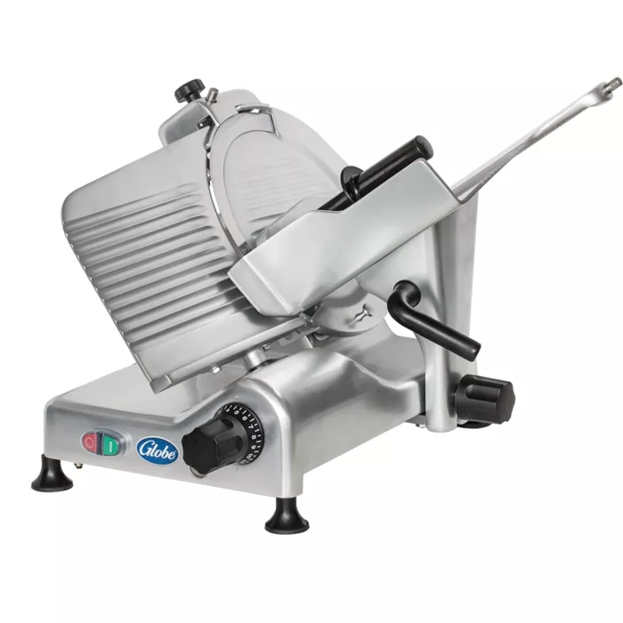This meat slicer is equipped with a positive traction grooved drive belt, a large food carriage and product receiving area, and a top-mounted, all-metal knife sharpener. The smooth stainless steel ball-bearing chute slide system ensures easy movement, while the ergonomically designed, the dual-purpose handle makes it comfortable to use. The 35° angled food chute allows for easy slicing and minimal waste, and the motor overload protection with manual reset ensures that the machine is safe to use.