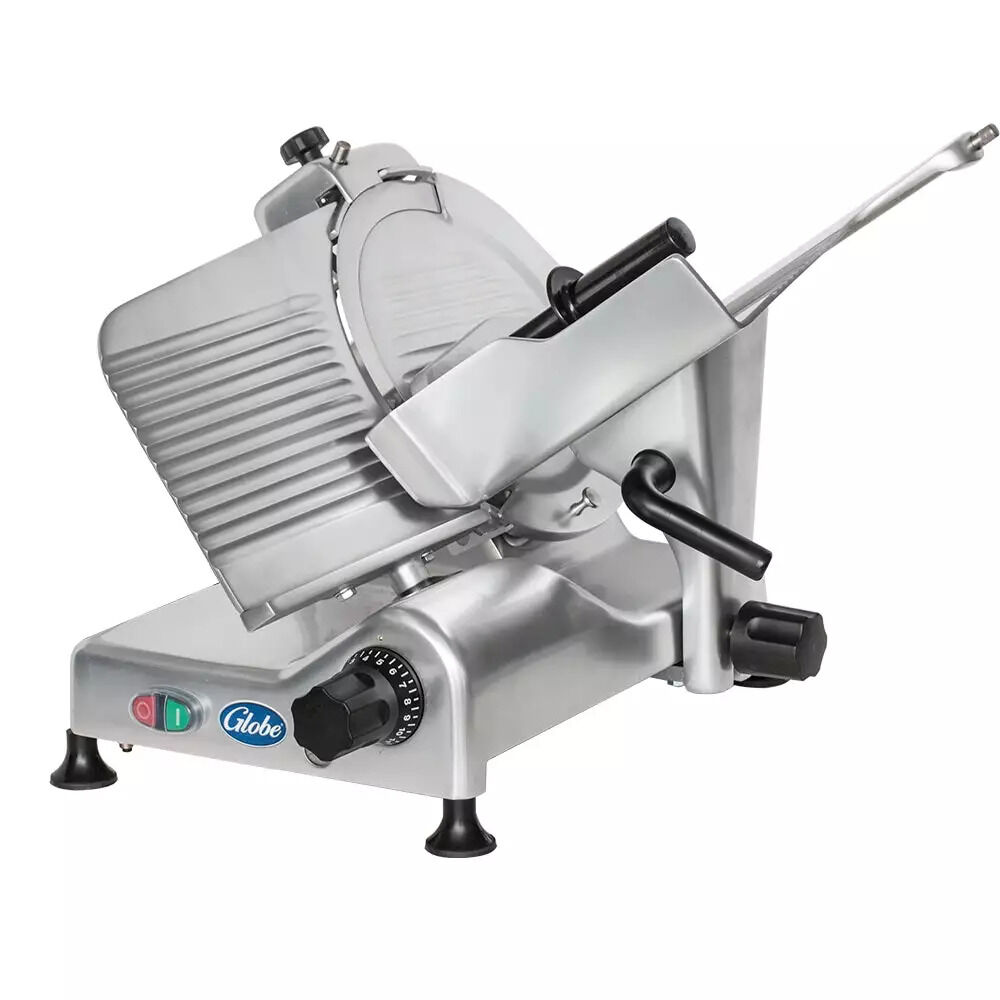 Introducing the Globe G-Series 12" Meat Slicer, a medium-duty machine that's perfect for slicing meats and other food products with precision and ease. This powerful slicer is equipped with a 0.5 HP motor and a hard chromed special alloy, a hollow ground knife that is longer lasting and easier to sharpen. With a slice thickness of 0 to 9/16", you can easily adjust the thickness to your desired preference. The extended rod, end weight, and chute can accommodate product up to 10.5" in length, while the gripping teeth on the underside of the end weight provide stability when slicing taller products. The pyramid-shaped end-weight teeth improve product hold during slicing, ensuring even slices every time.