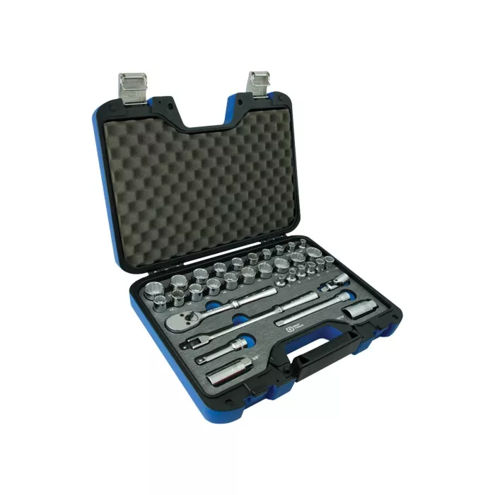 - Includes: 5/16" - 7/8" Regular sockets, 7 mm - 22 mm Regular sockets, 5/8" Spark plug socket, 13/16" Spark plug socket, Reversible ratchet, 3" Extension, 6" Extension, 9" Flex handle, U-joint, Blow mold case