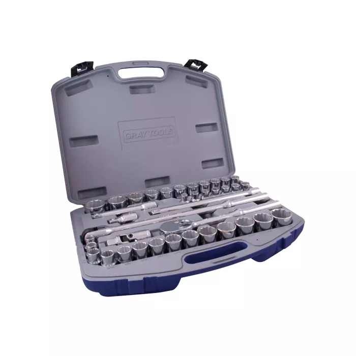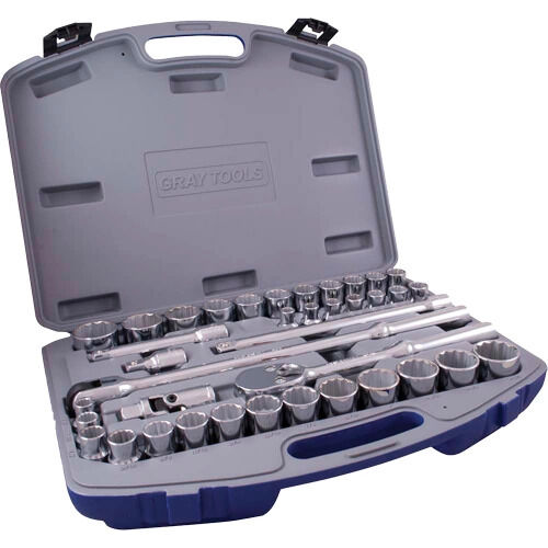 - Includes: 3/8", 7/16", 1/2", 9/16", 5/8", 11/16", 3/4", 13/16", 7/8", 15/16", 1", 1-1/8", 1-1/4", 10 mm, 11 mm, 12 mm, 13 mm, 14 mm, 15 mm, 16 mm, 17 mm, 18 mm, 19 mm, 20 mm, 21 mm, 22 mm, 23 mm, 24 mm, 27 mm, 30 mm, 32 mm sockets, Reversible Ratchet, 15" Flexible Handle, U-Joint and 2", 5" & 10" Extensions