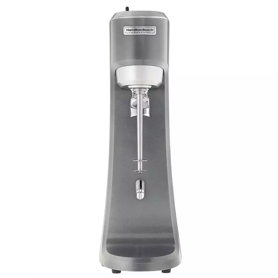 Durably built from heavy-duty, die-cast metal, Hamilton Beach Commercial Single-Spindle Drink Mixer can mix ice-cream shakes, flash bar drinks, and blend eggs or pancake batter. It comes equipped with a powerful 1/3-horsepower motor that features sealed, permanently lubricated ball bearings for long-lasting performance. The motor is balanced, which minimizes motor vibration. Controls include a three-speed rocker switch, plus a unique fingertip-action pulse switch for starts and stops. The mixer offers two ways to start and stop the mixing action - with the pulse switch or the cup guide, which pulls out for easy cleanup in the dishwasher. A 28-ounce stainless steel mixing cup is included.