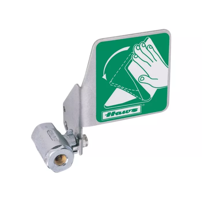 - Stainless steel push flag that operates a stay-open chrome-plated brass ball eyewash valve