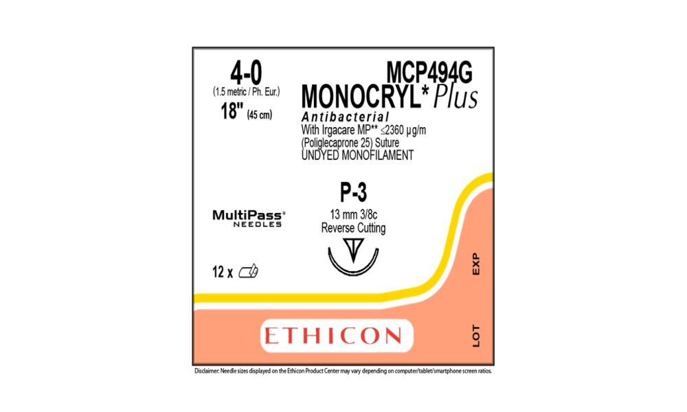 J&J Ethicon Suture MCP494G Monocryl Plus 4-0 P-2 13mm 18" Undyed 12/box