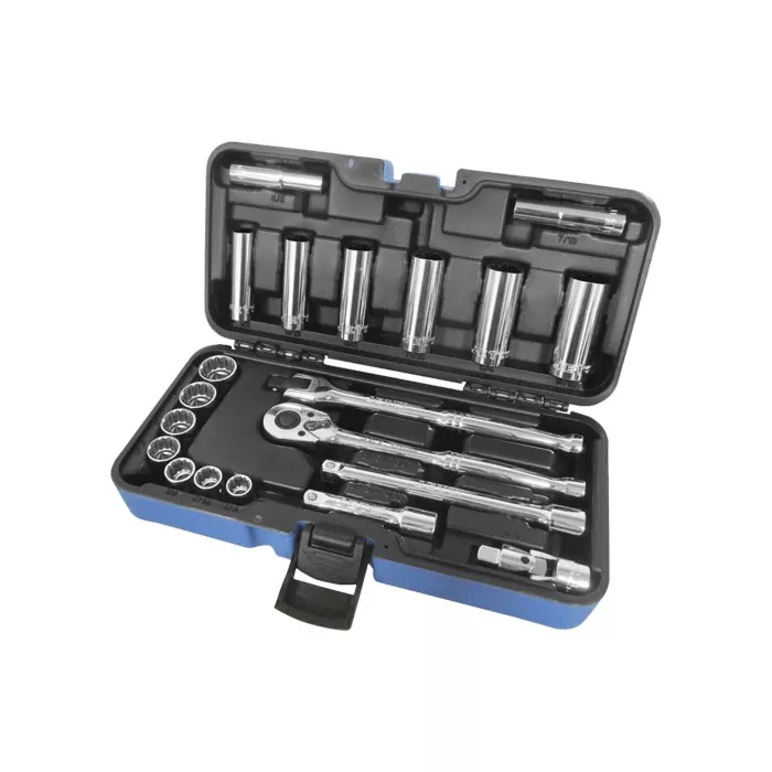 | Includes | Douilles profondes (3/8, 7/16, 1/2, 9/16, 5/8, 11/16, 3/4, 13/16"); douilles standard (3/8, 7/16, 1/2, 9/16, 5/8, 11/16, 3/4"); clé à cliquet à tête ovale 8" 48 dents à dégagement rapide (671926); rallonges 3" (671905) et 6" (671907); poignée flexible 8" |