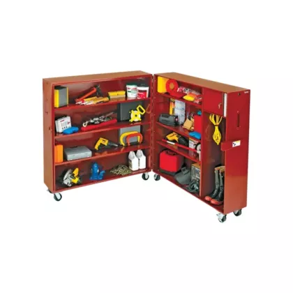 - Flexible interior storage: Movable top and bottom shelves, open storage closet and lockable storage locker