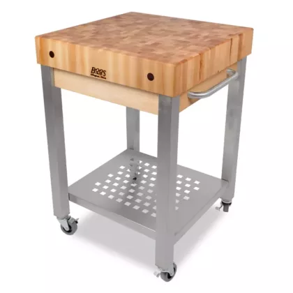 The John Boos Cucina Technica cart is the perfect blend of commercial-grade quality and contemporary style. Combining a 4" thick end grain butcher block with a commercial grade stainless steel frame. This hefty kitchen cart won’t let you down. Strong and durable for the heaviest of tasks and built to last with sturdy locking casters that offer smooth rolling mobility. Includes a lower undershelf for additional storage and a towel bar.