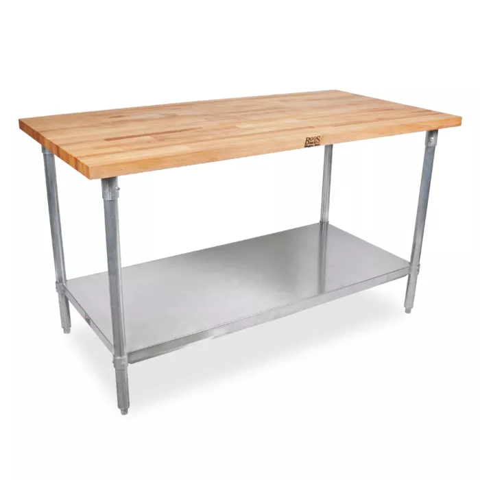 The John Boos Wood Top Work Table features a 1.5" thick Northern Hard Rock Maple top with galvanized legs and an adjustable undershelf. The wood top comes standard with our oil finish and provides additional counter space to any bakery, garage, commercial business or residential home. The galvanized undershelf can be used to store tools, supplies, or kitchen cookware. Available in 30” widths and various lengths. NSF & CSA Certified.