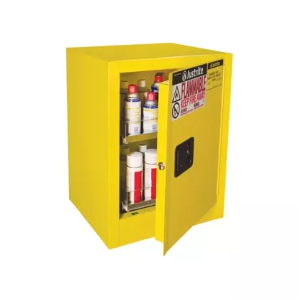 - Justrite's Aerosol Can Benchtop Safety Cabinet fits virtually anywhere for hassle-free organization of up to 24 aerosol cans
