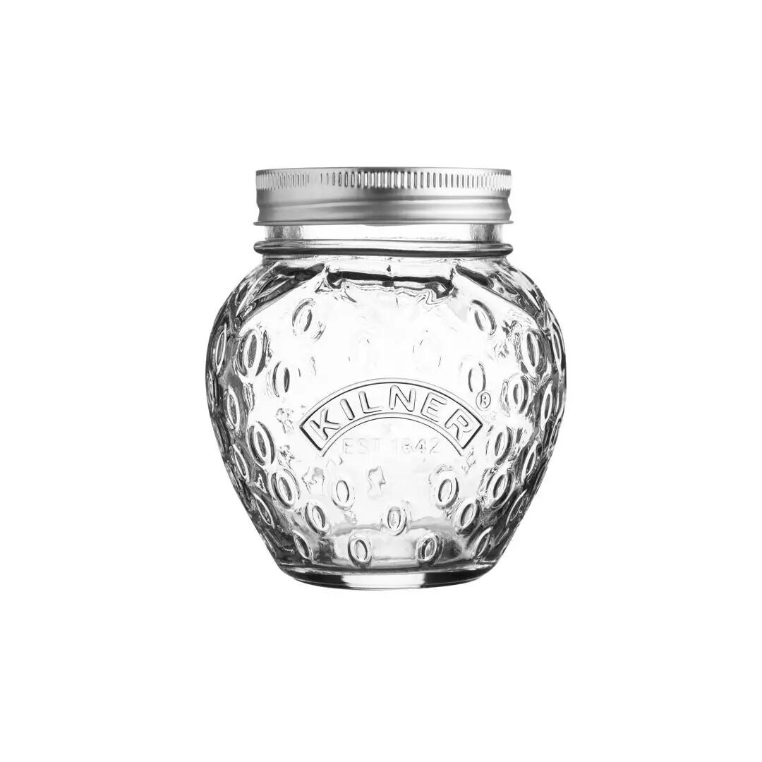 Strawberry Fruit Preserve Jar is perfect for storing and preserving healthy, home grown foods. Featuring a silver coloured 2-piece lid system which comprises of a tin disc and screw band ensuring a secure vacuum seal is achieved, keeping the contents fresher for longer. The jar capacity is 0.4 litres / 400ml which is the perfect size for jellies, preserves and especially strawberry jam. The jar shape has a unique novelty strawberry fruit shape design and enhanced with the authentic Kilner