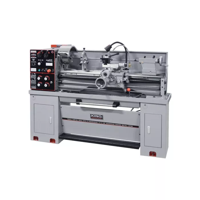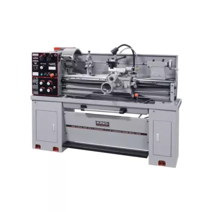 - Includes: 7"-3 jaw chuck, 8"-4 jaw chuck, imperial and metric gears, quick change tool posts, steady rest, follow rest, 12" D1-5 camlock face plate, coolant system, full length splash guard, thread chasing dial indicator, 2 MT#3 dead centers, MT#6-MT#3 sleeve, chip tray, tool box, halogen lamp, chuck keys, hex keys and cabinet stand (with foot brake incorporated)