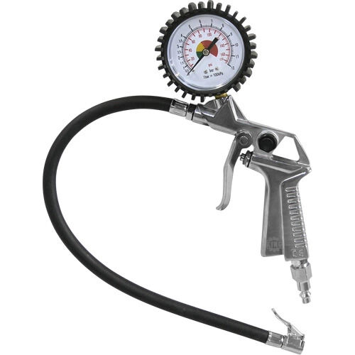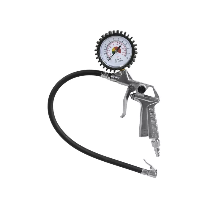 Easy-to-use combined unit with inflation gun, 15" flexible rubber hose with lever style chuck, rubber protected 2-1/2" diameter pressure gauge (pressure range of 10 - 170 PSI) and a quick connect 1/4" NPT air inlet