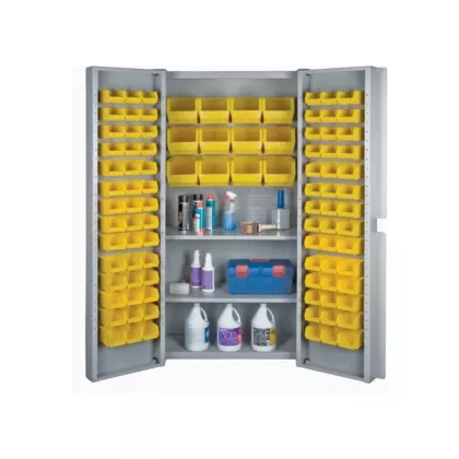 - Incorporates louvered bin hanging panels welded to the cabinet's back and doors ;