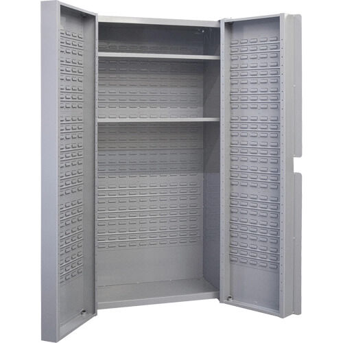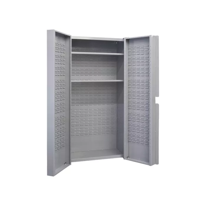 - Incorporates louvered bin hanging panels welded to the cabinet's back and doors ;