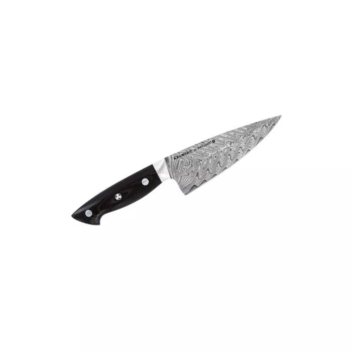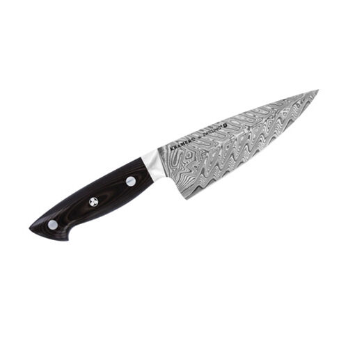This all-rounder for professional and hobby chefs, also called a cook's knife, is a versatile kitchen knife. The heft, weight and balance of this knife allow it to be used for both heavy duty work with thicker cuts of vegetables, fruits and meats or mincing and chopping herbs. The curved blade enables a rocking cut and wide surface enables knuckle clearance and gathering of cut materials . Micro-Carbide SG2 powdered steel core. Acute 30° edge angle with stainless steel half bolster. 63° Rockwell hardness and full tang. Hand finished Micarta handle with stainless steel rivets and mosaic pin