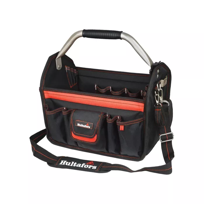 - Open-top tool carrier with collapsible bar handle and ballistic polyester fabric is durably designed to help work with maximum visibility and access to all tools and accessories