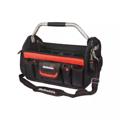 - Open-top tool carrier with collapsible bar handle and ballistic polyester fabric is durably designed to help work with maximum visibility and access to all tools and accessories