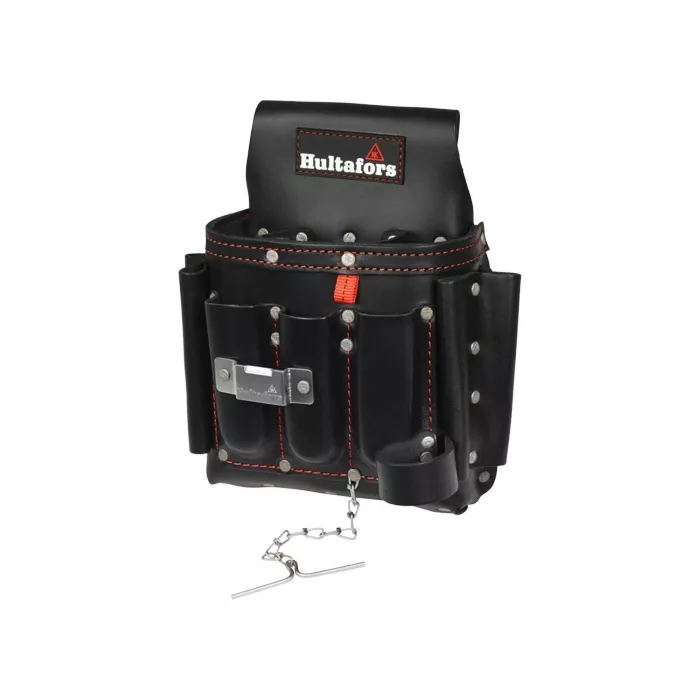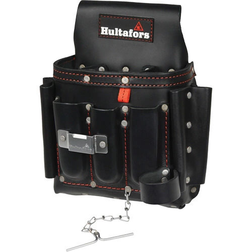 - The premium quality leather Electrician's Tool Pouch features a large main pocket and 7 smaller pockets and sleeves to hold your favorite tools, includes a hammer loop, tape chain, and tape measure clip