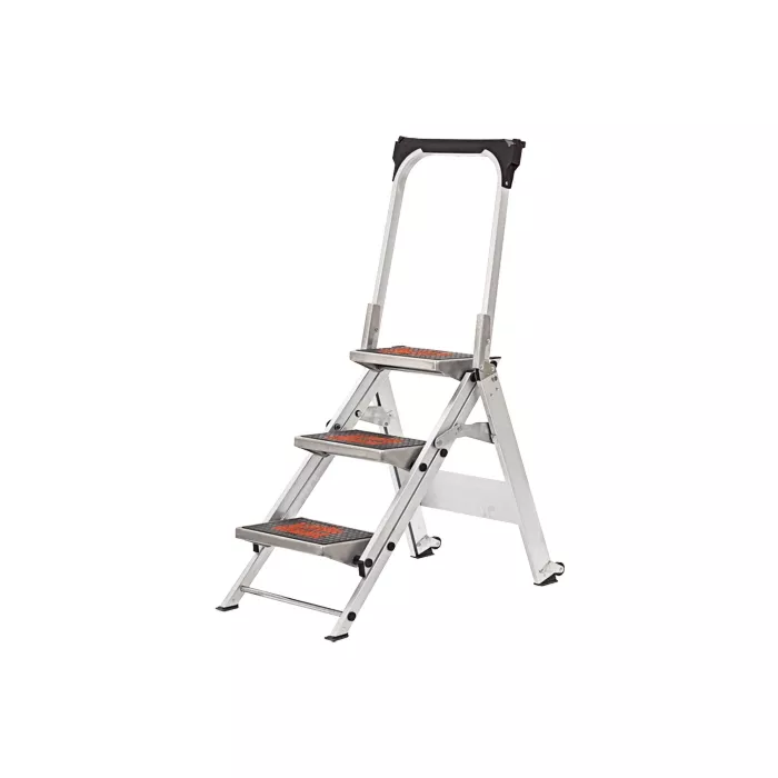 - Wide, slip-resistant treads for maximum stability and a fold-up safety bar with integrated tool tray