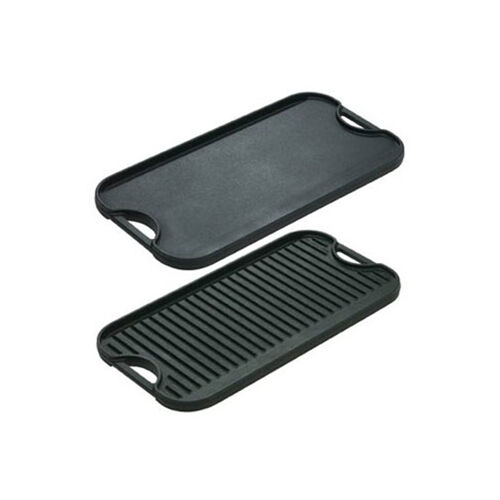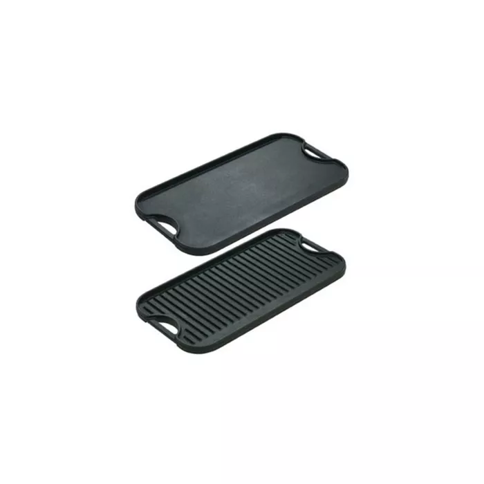This professional-size cast-iron grill/griddle combo from the Lodge Logic series measures 20 by 10-1/2" (with an actual cooking surface of 19-1/4 by 8-1/2"), serious enough to straddle either a campfire or two burners on your stovetop. The reversible feature of this crowd-pleasing cooker means you can use the smooth side for cooking flapjacks, eggs, and grilled cheese sandwiches, and the ridged grill side for hamburgers, steaks, and sausages. A slight slope drains fat into a generous grease gutter.
