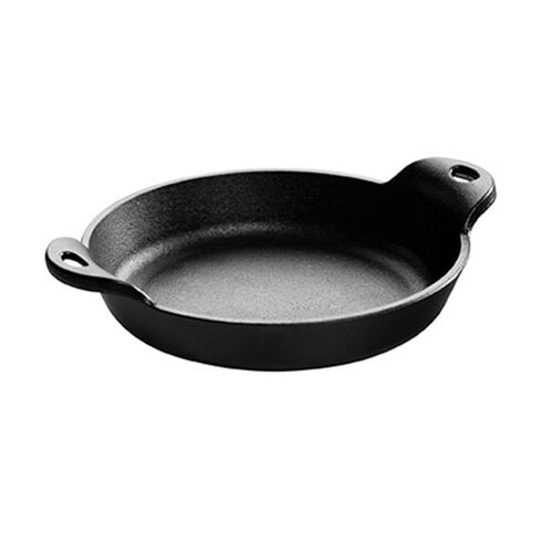 14 oz., 6-3/8" dia., 8-1/16" length x 1-1/16" deep, heat-enhanced and seasoned, dishwasher safe, cast iron.