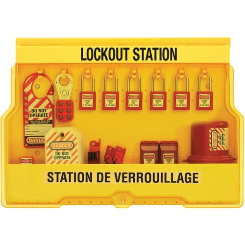 - Includes: 6 padlocks, 1 hasp, 1 snap-on hasp, 1 compact plug prong lockout, 1 plug cover, 4 circuit breaker lockout , 2 wall switch covers, 2 packs of tags (12/pack)