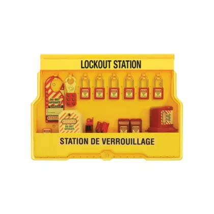 - Eight hanger clips hold two padlocks or lockout hasps each