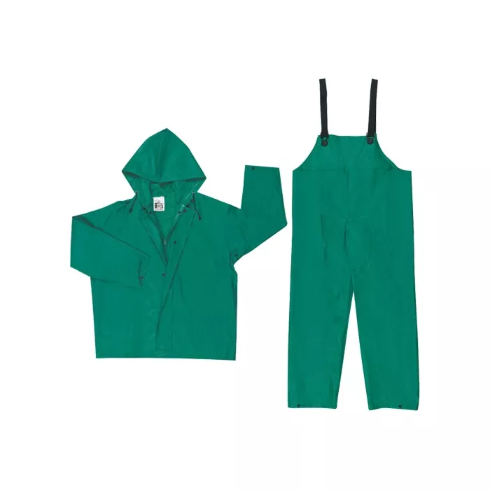 - Jacket features a zipper front, oversized storm flap, attached hood, and inner sleeves to prevent splash back