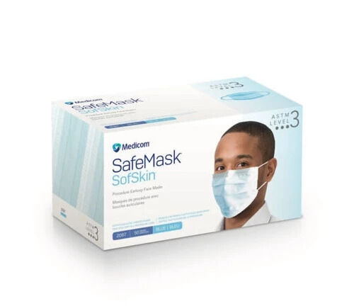 The Medicom SafeMask SofSkin Earloop Mask is a high-quality, disposable mask designed to provide superior protection and comfort. It meets ASTM Level 3 standards, making it suitable for environments with a high risk of fluid exposure. The mask is constructed with soft, hypoallergenic materials that are gentle on the skin, ensuring comfort during extended wear. The earloop design allows for easy donning and removal, while the blue color provides a professional appearance.