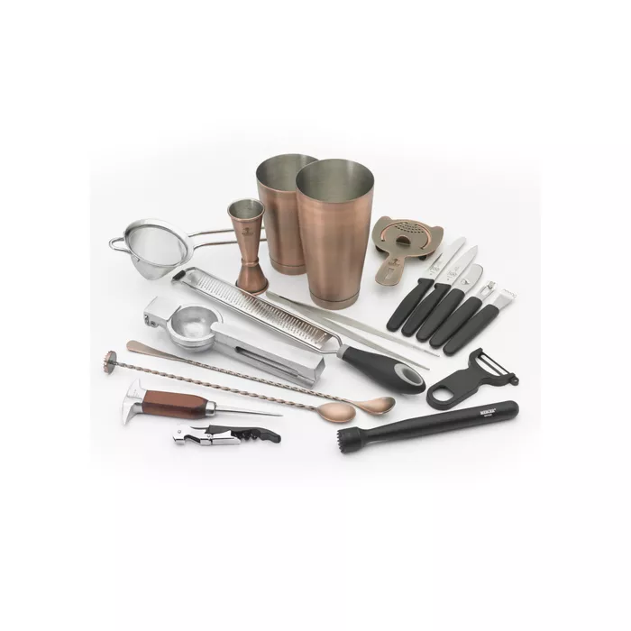- 18-pieces include: (1) cocktail shaker set, (1) fine mesh strainer, (1) 9-3/8” precision plus™ straight tong, (1) 11-13/16” bar spoon with muddler end, (1) heavy-Duty spring bar strainer, (1) 1 ounces x 2 ounces jigger, (1) 13-3/16” bar spoon, (1) black y-Peeler, (1) channel knife, (1) composite muddler, (1) ice pick, (1) cast aluminum juicer, (1) orange peeler, (1) citrus zester, (1) waiter’S corkscrew, (1) 4-1/3” rounded tip, Wavy edge bar knife, (1) 4” pointed tip, Plain edge bar knife, (1) narrow fine zester
