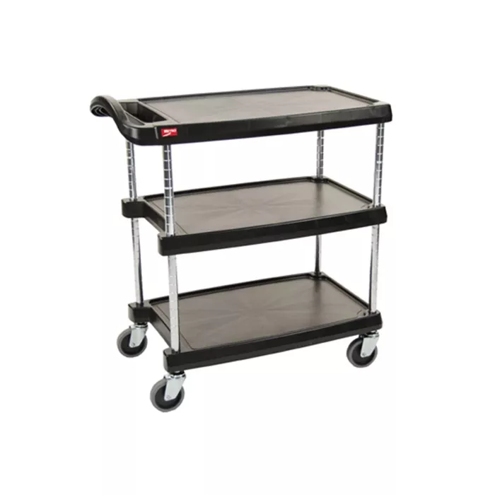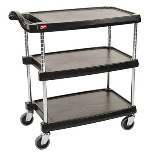 myCart Series Utility Cart, 3-shelves, open base, 23-7/16"W x 34-3/8"L x 35-1/2"H, including handle, heavy duty plastic shelf, with (4) swivel/resilient tread casters, 3-shelf cart has a 400 lb. capacity per unit, black, NSF